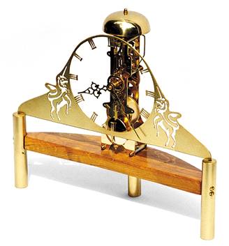 Kazalca tipa Flavoured skeletne ure Deva, zasnovane po mitološkem izročilu o samorogu in devici, poganja štirinajstdnevni nihajni mehanizem Hermle W0791-081, postavljen na hruškovo lamelo. Lamela je trinožno podprta z medeninastimi nogami, na katere je nasajeno urno lice. Lice je ročno izrezlajano iz medeninaste pločevine. Ure na številčnici so zapisane z izvirnim zapisom številk. Noge in lice so suhoprašno lakirane. Lesena lamela pa je lakirana z akrilno lazuro. Skeleton clock Deva (virgin) — based on mytholigical tradition about unicorn and virgin: rustical pear; cutout brass; 14-days clock mechanism Hermle, Grosheim, Germany; clock hands type Flavoured. Dimensions: 35/8/30cm Price: 1900 EUR at direct order. Delivery: Slovenia: Free »white gloves delivery«. EU countries: 280 EUR »white gloves delivery«. Worldwide: 270 EUR post delivery