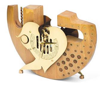 Mantel clock Elvira — based on folk narrative about mysterious fate of Elvira from Ljubljana: laminated beech; Floral style engraved brass; cristal glass Swarovski; bim-bam clock mechanism Hermle, Grosheim, Germany; clock hands type Sword