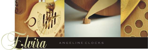 Text Box: V medninasto lice ure cepetavke Elvira, zasnovane po ljudski pripovedi o skrivnostni usodi ljubljanske Elvire, je ročno graviran cvetlični motiv s številčno skalo. Številke so zapisane z izvirnim zapisom. V medeninasto paličico je vdelano kristalno steklo Swarovski. Telo ure je izdelano iz laminirane bukovine v katero so vdelani medeninasti prstani, polnjeni z masivno bukovino. Telo je lakirano z nitro lakom. Kazalca tipa Sword žene osemdnevni bim-bam mehanizem Hermle W0130-070.