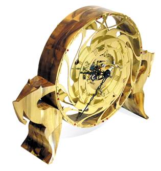Drum head clock Kresnica — based on folk tradition ceremony to glorify Slavic goddes Kresnik — Sun god: laminated acacia; cutout brass; cristal glass Swarovski; bim-bam clock mechanism Hermle, Grosheim, Germany; clock hands type Louis XV.